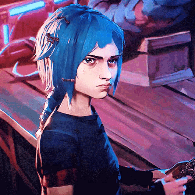 The next time we see Powder, she has changed astronomically. She goes by Jinx, and her knack for tinkering and inventing has grown. She helps Silco with his crimes, and has become a valuable asset. Silco has become her father figure. Jinx’s design has now changed, and her blue hair is in two extremely long braids adorned with brass cuffs. The front of her hair falls wildly in choppy bangs and strands.